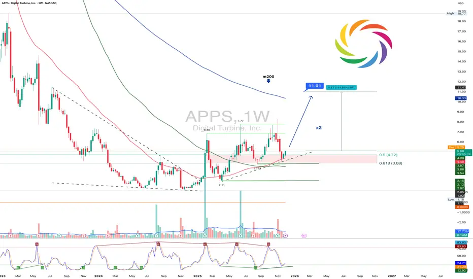APPS is trading at 5.08 and holding above the demand zone between 3.88 and 4.72. These levels correspond with Fibonacci 0.5 and 0.618 and continue to attract buyers. A golden cross between ma50 and ma100 has formed and the ma200 above creates a clean technical structure for a potential breakout. The chart suggests a move toward 7.77 while a confirmed break above it may open the way toward 11.01.
