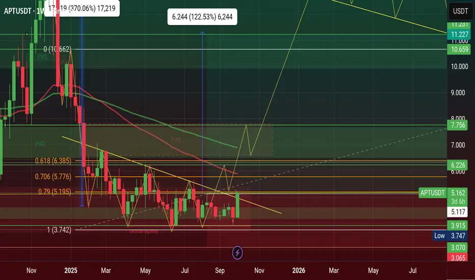 Looking at the 4-hour chart, Aptos price has broken out of a downtrend that kept it under pressure for weeks. The price pushed up from the $4.20 support zone and is now testing resistance just above $5. The rally marks the strongest momentum since early July.