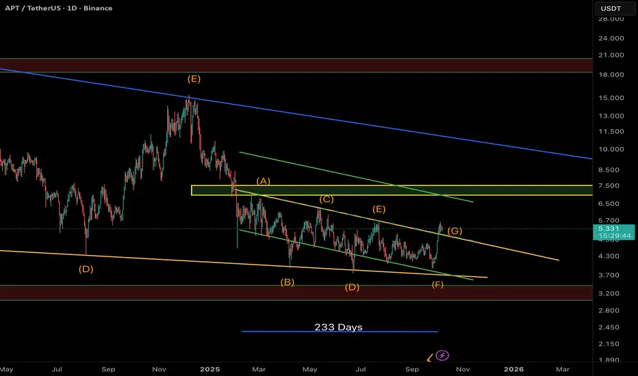 Currently, price has broken out of the descending channel, confirming the start of Wave G, which could extend toward the $7.0 zone — aligning with the previous Wave A resistance.