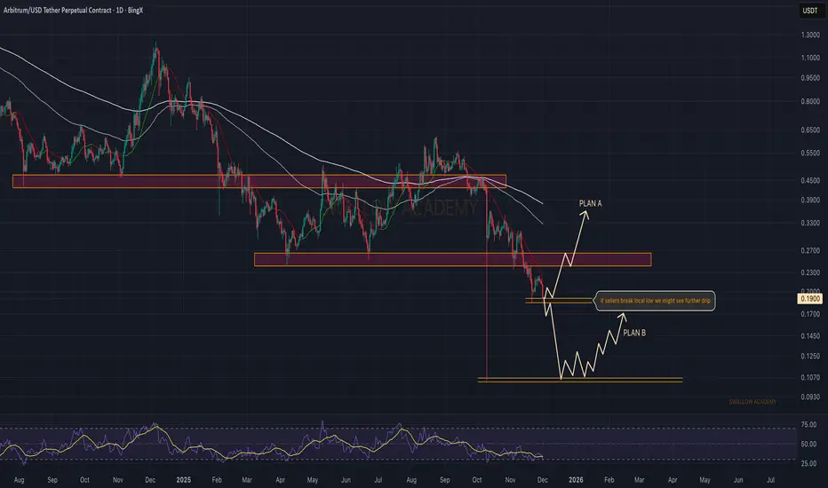 ARB is trading right above a local support zone that has been reacting well in the past. For now the key level is the local low — if sellers break it, we’ll most likely see a deeper move into the lower support area where Plan B would activate.