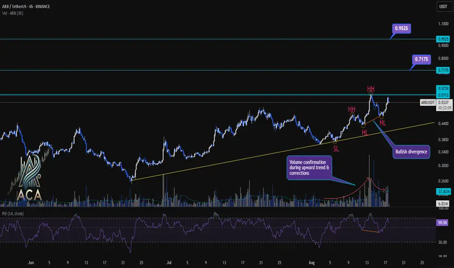 The chart shows ARBUSDT maintaining a solid uptrend, respecting its ascending trendline while consistently printing higher highs (HH) and higher lows (HL). This structure underscores ongoing bullish conviction. Price action recently staged a strong bounce off the trendline with marked bullish divergence on RSI, and volume confirmation adds muscle to the move.