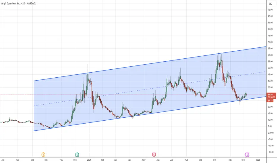 ARQQ tends to move from lower channel support → midpoint dashed trendline → upper channel resistance, suggesting very predictable long-wave cycles.
