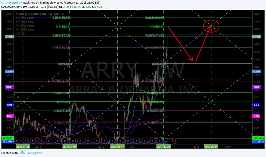 ARRY if symmetry holds on weekly chart the most probable target is 18.49 June 2019 but a bullish extension to 29.29 is possible. So I will be watching for either a break above 18.39 for the extension above or retrace to 13.46 region for a bounce. Alarmed and ready. I'm leaning toward a break-out to upside. If so I will model it on a shorter time-frame and publish a specific trading plan with buy and sell triggers.