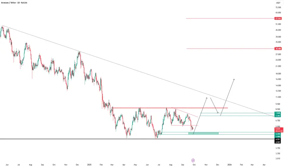 AR is currently trading around $5.630, consolidating above a key support zone near $5.240. Price action shows a downtrend line pressing from above, but buyers continue to defend the blue support area.