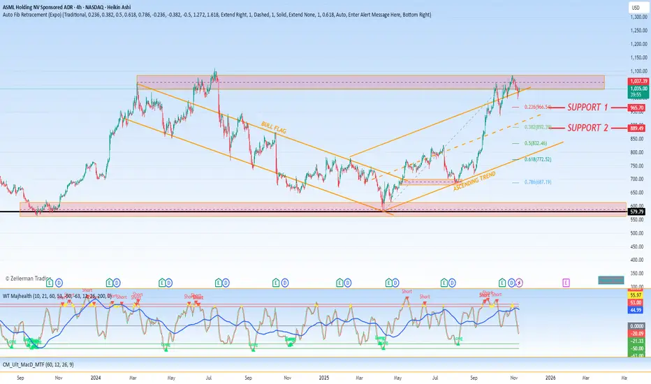 ASML) is exhibiting a compelling technical picture defined by a period of consolidation within a larger bullish structure. The chart has formed a clear Double Top pattern followed by a Double Bottom, signaling a battle between buyers and sellers that has now resolved to the upside. This sequence, coupled with the recent formation and subsequent breakout from a Bull Flag pattern, indicates a resurgence of bullish momentum. Our analysis confirms a renewed upward trajectory, with key Fibonacci retracement levels at $966.54 and $892.39 established as critical support zones for any future pullbacks.