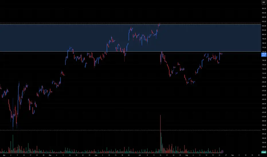 ASML is rebounding after a sharp drop earlier this summer, now pushing into a major overhead gap resistance zone between ~760–830.