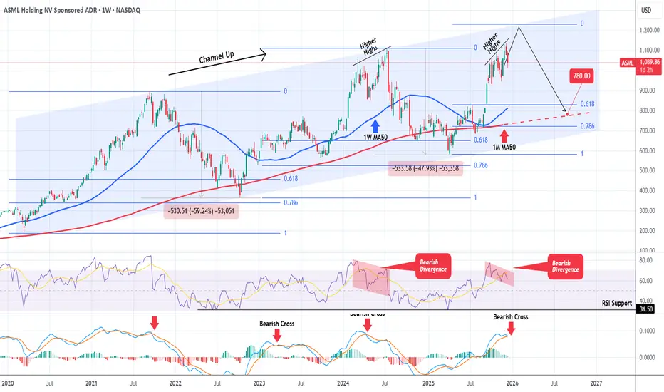 ASML Holding (ASML) has been trading within a Channel Up since the March 2020 COVID Low and is currently approaching its Top. With the 1W RSI on a Bearish Divergence (Lower Highs against the price's Higher Highs) and the 1W MACD about to form a Bearish Cross, the stock doesn't have much room left to rise before peaking.