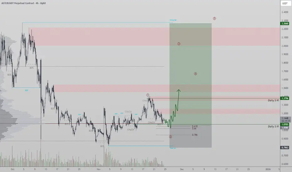Aster is sitting on a major confluence area that includes the 0.618 Fibonacci, daily support, and the Point of Control. This region is acting as a strong technical base where buyers have historically stepped in.
