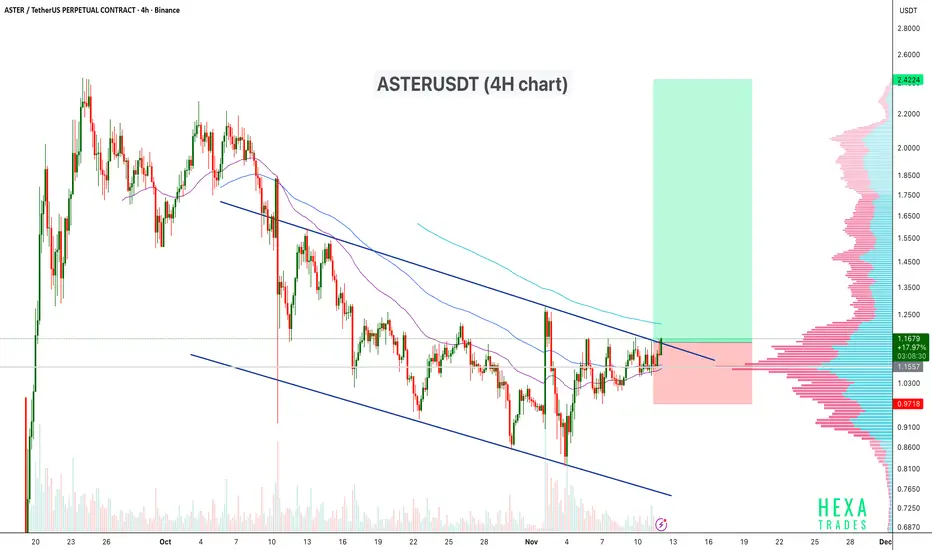 ASTERUSDT is trading within a descending channel on the 4H chart, showing consistent lower highs and lower lows over the past few weeks. The price is now testing the upper trendline of the channel, signaling a potential breakout attempt. A confirmed breakout with volume could indicate a shift in trend momentum toward a bullish reversal.