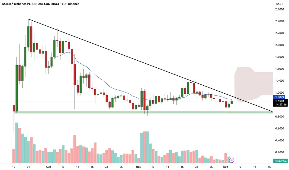 On the 1-day chart, **ASTER/USDT** is moving within a clear descending triangle structure, showing consistent lower highs while holding a strong horizontal support around the **$0.97–$1.00** zone. Price has recently bounced slightly from this demand level but remains capped below the descending trendline resistance, which has been respected multiple times since October. The candles are showing mild recovery momentum, yet the 9-EMA is still acting as dynamic resistance, keeping the overall bias mildly bearish until a decisive breakout occurs.