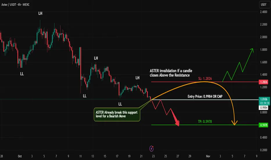 According to Dow Theory, the market defines a downtrend when it consistently forms Lower Highs (LHs) and Lower Lows (LLs) — and that’s exactly what #ASTER is showing on the 4H timeframe.