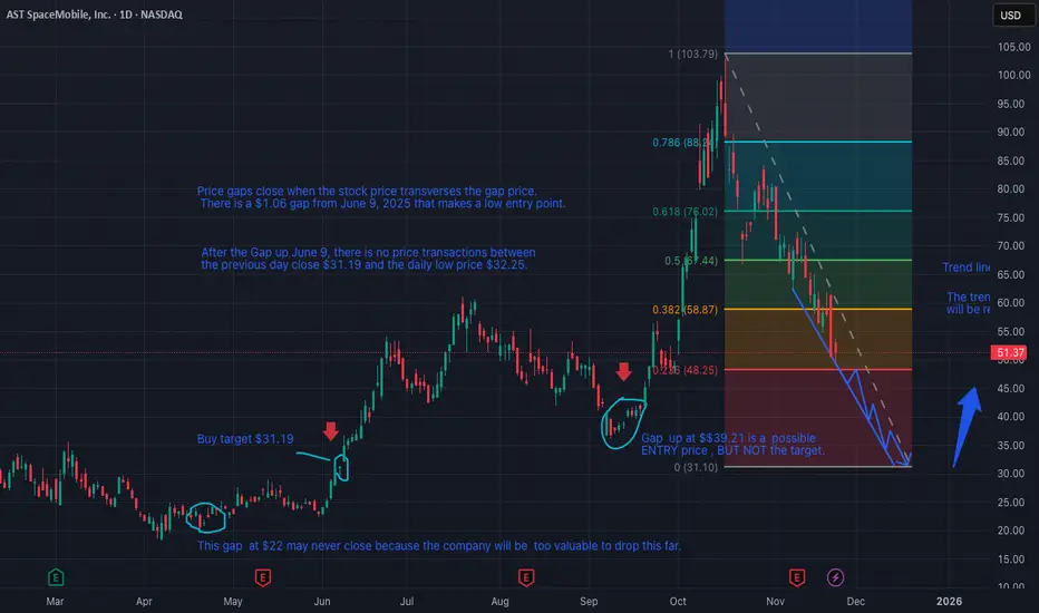 The gap between $31.19 - $32.25 ($1.06 gap) from June 6 - June 9, 2025, is the lowest gap that I will consider buying. ( I will place a buy order at $31.20 to assure it can get filled. Sometimes gaps will get filled right on the money and sometimes it goes below. ) The gap is on target to be filled mid- December. ASTS is launching satellites on December 15. If the launch is successful the price is likely to rise with positive news.
