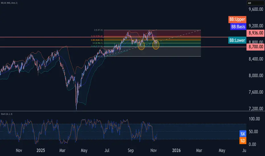 AUS200 index recently reversed up with the daily Hammer candlesticks reversal pattern from the support area between the key support level 8700.00 (which has been reversing the price from September), lower daily Bollinger Band and the 61.8% Fibonacci correction of the sharp upward impulse from June.