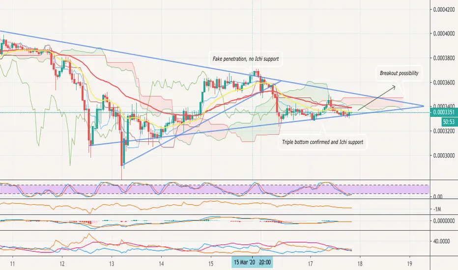 Currently ATOMBTC formed a triple bottom pattern and accumulated for a bounce, moreover Ichi is now acts like a support and attracts the price action to the higher zone which can result in a massive breakout in the short-term