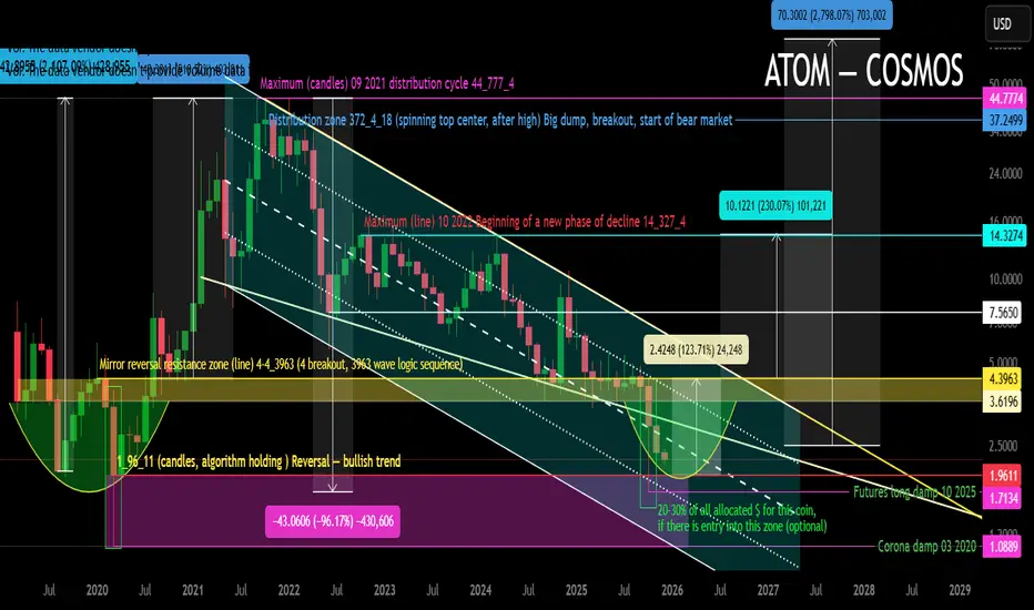 Logarithm. 1-month time frame to visualize the primary trend. Price is in a downward secondary trend channel right at the distribution zone of the 2021 super hype wave. The hype is dead, but it's highly likely to revive when it makes sense from the overall market perspective. That's why, after so many years, I'm publishing this idea + I'll show you something else.