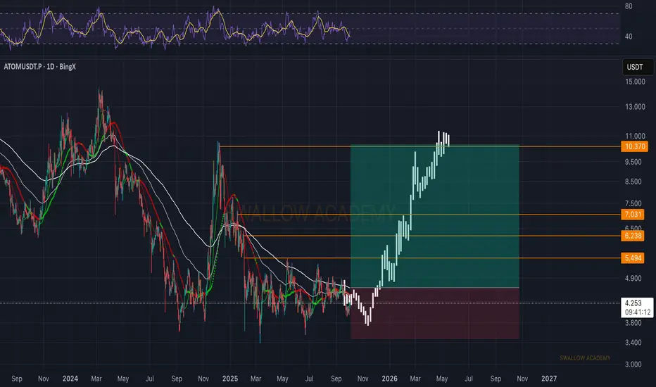 ATOM has shown a strong bounce from the bottom zone and buyers have taken full control, driving the price back above key EMAs and straight into recovery mode. Current focus is the $10.3 resistance zone, which will act as the main level to watch. A clean breakout here could open the way toward higher continuation, while any rejection would likely pull price back to retest $7–$6.2 as support.
