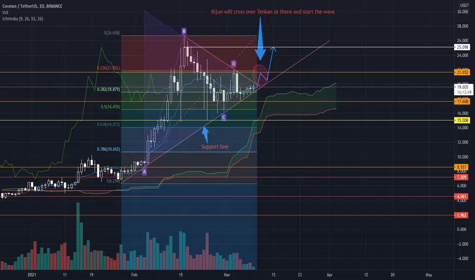 ATOM/USDT you can buy now or wait until the triangle pattern broked. The Kijun will cross over Tenkan at there and start the waves, ATOM are flying above Ichimoku clouds is good. Hope it's improve your profits !