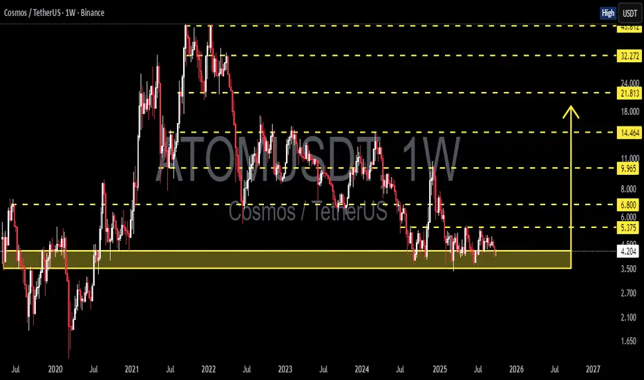 The Cosmos (ATOM/USDT) Weekly chart is at a decisive point. Price is currently sitting inside the historical support zone around 3.5 – 4.5 USDT, which has acted as a strong defense since 2020. Every time ATOM touched this area, a rebound followed — but this time the repeated tests suggest the support is getting weaker.