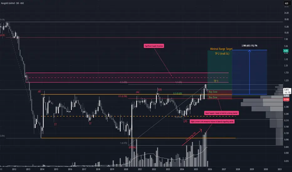 You could begin scaling in here, but the more compelling support zone sits closer to ~$0.56. Notably, October closed with heavy volume and a bearish engulfing candle so ideally, we want to see this pullback continue on declining volume with overlapping candles. That would signal absorption rather than distribution.