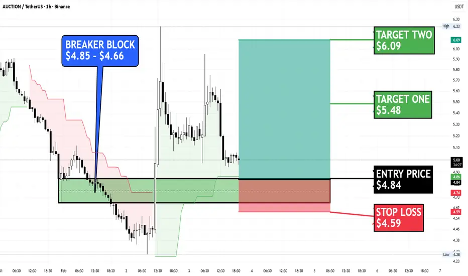 The zone between $4.85 – $4.66 acts as a high-probability breaker block, where prior supply failed and buyers regained control. As long as price holds above this level, the bullish continuation scenario remains valid.
