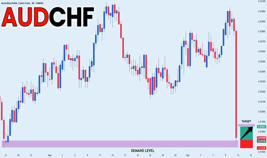 ✅AUDCHF shows a strong displacement after tapping into the demand level, signaling ICT-style bullish order flow. The rejection wick confirms accumulation, with price expected to target 0.51851 as short-term liquidity pull.