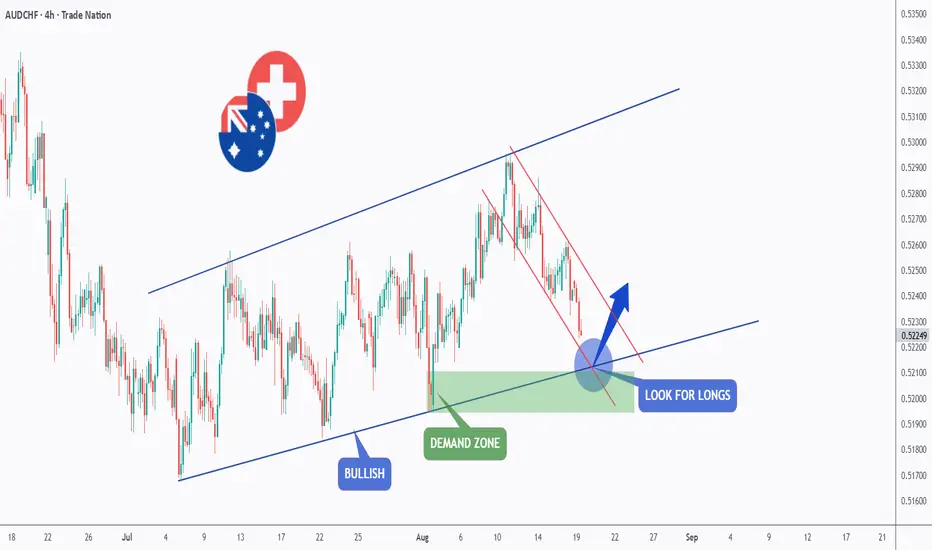 AUDCHF has been trading inside a broad ascending channel, showing a clear bullish structure. Recently, price pulled back within a corrective descending channel and is now approaching a key demand zone aligned with the lower bound of the channel.