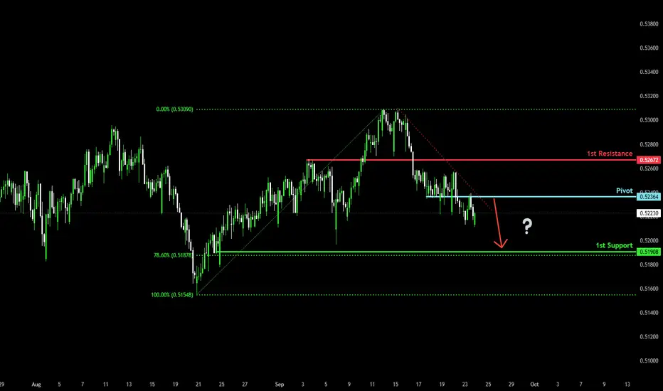AUD/CHF has rejected off the pivot and oculd drop to the 1st support which aligns with the 78.6% Fibonacci retracement.