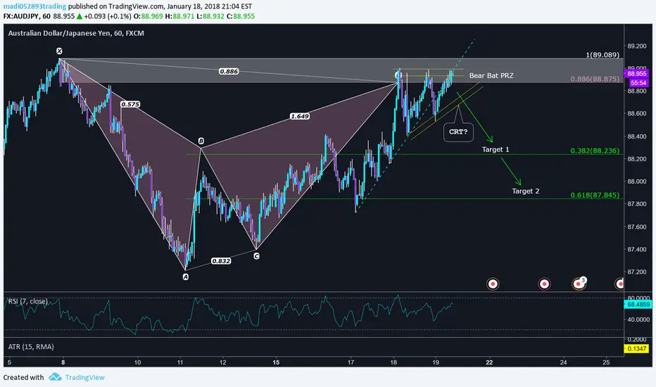 Hi guys, a short/sell opportunity here. A pattern completion of bearish bat is on Play while forming a potential ascending triangle. Two ways on how to trade this, enter aggressively and stops just above the patterns' X point or wait for a breakout to the downside of the ascending triangle and enter short as this would be our confirmation (conservative). Trade at your own risk.