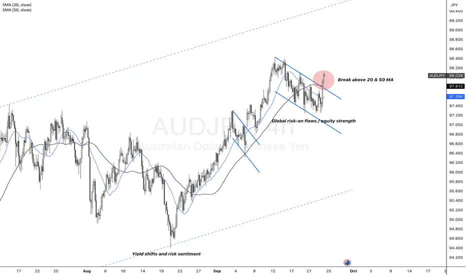 AUDJPY has extended its breakout from the flag formation, reinforced by a decisive move above the 20- and 50-day moving averages. This alignment signals strengthening trend momentum within the broader ascending channel. Near-term catalysts remain RBA policy signals, BOJ guidance, and broader risk sentiment, with the upper channel boundary now the next technical focus.