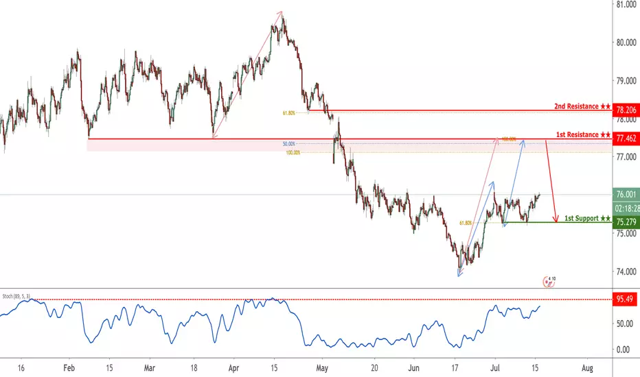 AUDJPY expected to rise up to 1st resistance at 77.462 where it could potentially react off and drop down to 1st support at 75.279.