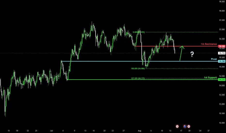 AUD/JPY is falling towards the pivot which has been identified as an overlap support and could bounce to the 1st resistance.