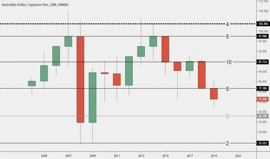 I start my analysis of each of the 22 currency pairs I trade by looking at the yearly chart. What? The yearly chart! Why? Because it is here that I find the most important swing levels. OK! OK! What is a "Swing Level?" A swing level is an important price level on the chart where traders make trade decisions. If there are more buyers than sellers at a swing level the market moves upward. If there are more sellers than buyers the market moves downward. A swing level on a chart is a price level that determines if the future price direction is going to be up or down. So how do I determine swing levels? To find these swing levels I look for price levels where bullish candles open at a swing level and close above the swing level and also where bearish candle open at the same swing level and close below the swing level. In addition if a bullish candle opens above a swing level its lower shadow must touch or move through the swing level and if a bearish candle opens below the swing level then its upper shadow must touch or move through the the same swing level. Further a bullish candle can open below a swing level and close at a swing level or a bearish candle can open above a swing level and close at the same swing level. Also if the bullish candle closes near a swing level but not at a swing level then its lower shadow must touch or move through the swing level or if a bearish candle opens near a swing level but not at a swing level its upper shadow must touch or move through the same swing level. Confused? I am! Let me show you what I mean by looking at some examples on a chart. On the chart look for the horizontal line identified with the number "8". This swing level shows there were 7 times when bullish candles opened at or above this swing level with their lower shadows touching or moving below the swing level or bearish candles closing at or above the swing level with their lower shadow touching or moving below the swing level. This line also shows 1 candle opened at the swing level and closed below it. Now look at the other swing levels and analyze them until you can reach the same count as I did.