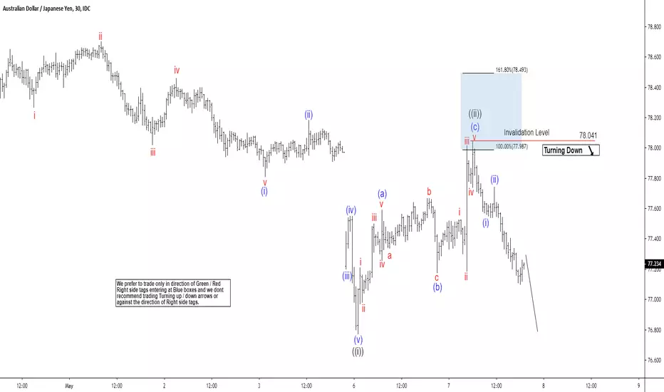 Wave ((ii)) ended at the blue box area (78.041). We don’t like buying the pair and like to stay short from the blue box area with a risk free position. As long as it stays below 78.041 peak it is expected to extend lower.