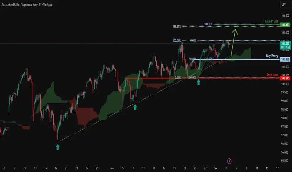 AUD/JPY has bounced off the support level, which is a pullback support that aligns with the 50% Fibonacci retracement and could rise from this level to our take profit.