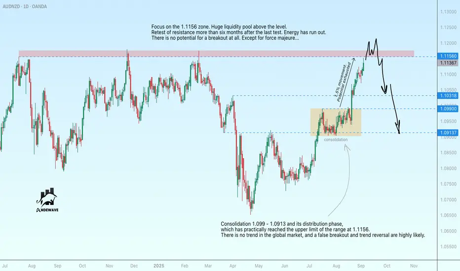 Focus on the 1.1156 zone. Huge liquidity pool above the level. Retest of resistance more than six months after the last test. Energy has run out. There is no potential for a breakout at all. Except for force majeure...