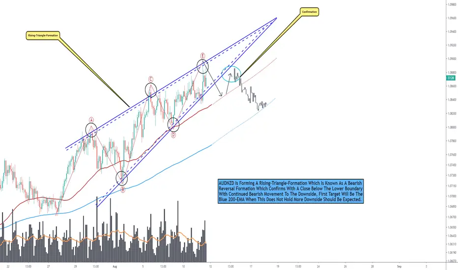 Looking at the chart you can watch there that AUDNZD is building this preliminary rising-triangle-formation marked in blue where the price already touched the upper and lower boundary several times also with a matching wave count ending with the current wave in the structure. Overall this is a bearish reversal formation pointing to the confirmed downside when the price closes properly below the lower boundary of the formation with a second touch of the lower boundary before a continuation to the downside can be considered. When looking on the bullish perspective the possibility is highly marginal the bearish one much more likely nevertheless a close above the higher boundary can invalidate the bearish scenario and therefore the formation. This breakdown can be traded either aggressively or conservative, the aggressive approach is an immediate entry in the triangle, the conservative is waiting on the confirmation then placing the order, the first target will be the 200-EMA marked in blue when this level does not hold the pair has increased potential to move lower.
