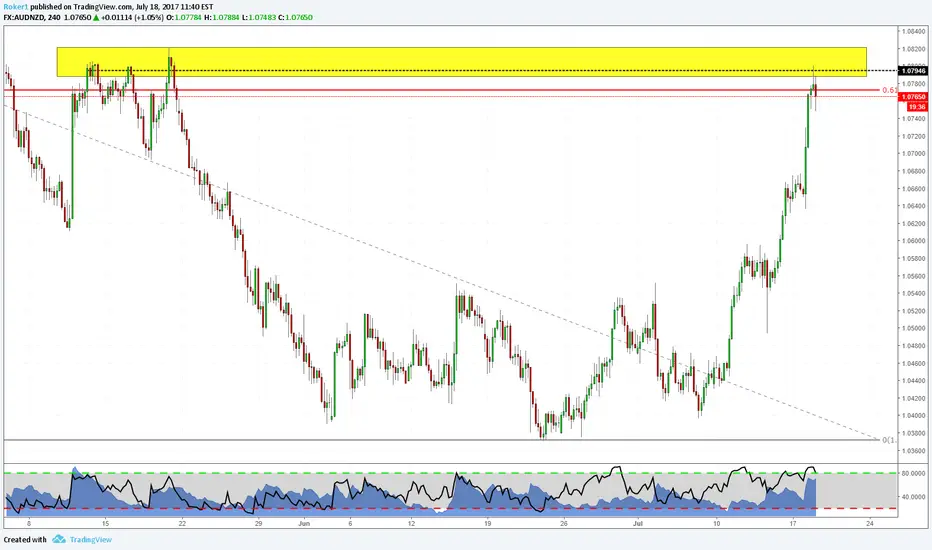 lately this pair had a huge increase in value, and that's due to AUD strenghtening over the last period. But this doesn't mean we can't look for shorting opportunities if they come. In this case we have an oversold condition on RSI at a structure daily level along with 618 retracement of the bigger daily leg. The conditions for a retracement are there, and i call it a retracement because i think this is definitely continuing in his upward direction overall. So be aware of it and play it safely. I'm waiting for a confirmation on this timeframe or the hourly.