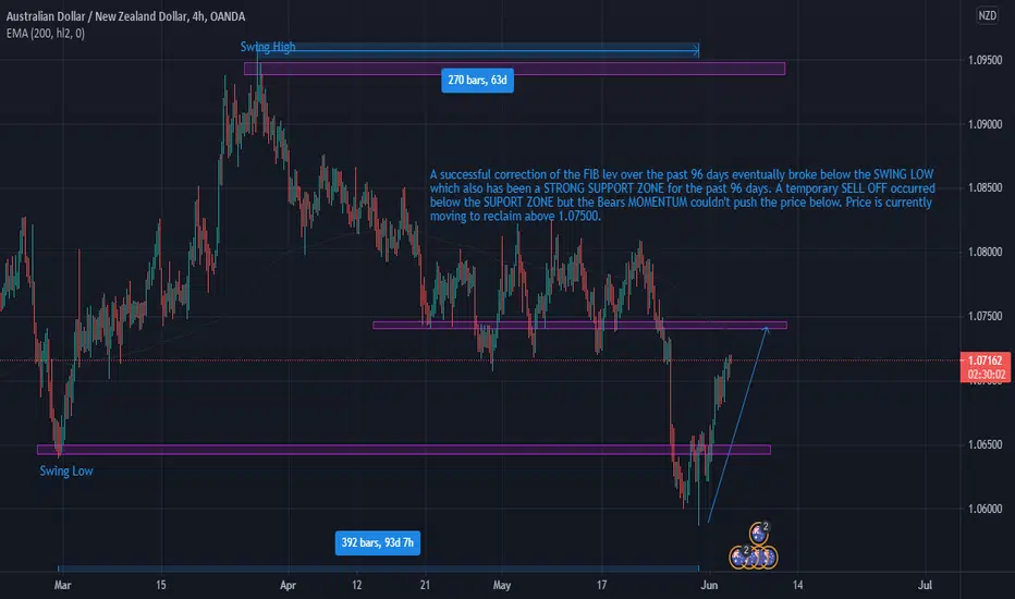 A successful correction of the FIB lev over the past 93 days eventually broke below the SWING LOW which also has been a STRONG SUPPORT ZONE for the past 93 days. A temporary SELL OFF occurred below the SUPORT ZONE but the Bears MOMENTUM couldn't push the price below. Price is currently moving to reclaim above 1.07500.