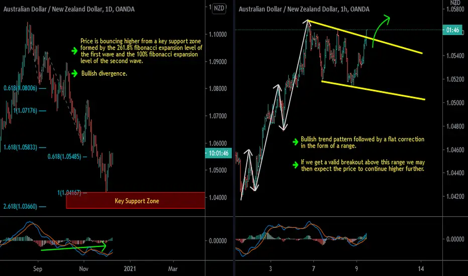D1 - Price is bouncing higher from a key support zone formed by the 261.8% fibonacci expansion level of the first wave and the 100% fibonacci expansion level of the second wave.