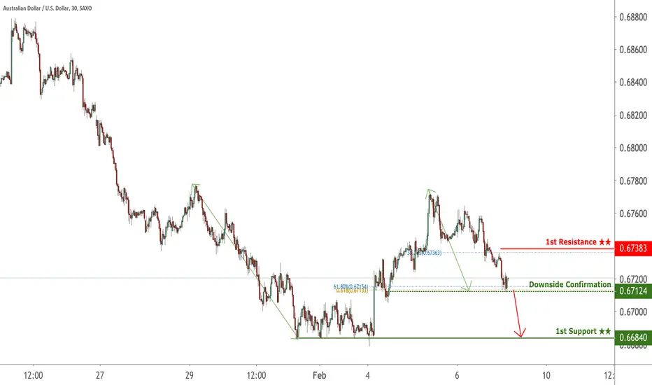 AUDUSD to reverse from its downside confirmation at 0.67124 where it could potentially drop further to 0.66840.