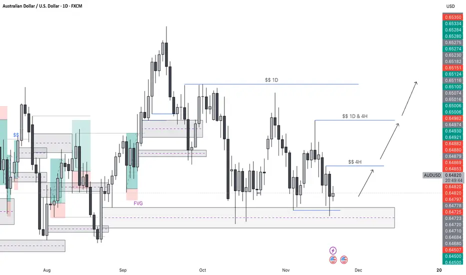 This chart highlights a multi-timeframe liquidity framework, combining 1D and 4H supply/demand zones to outline potential price reactions. Current price action is consolidating within a higher-timeframe demand zone, suggesting the possibility of a bullish response. The marked 4H and 1D liquidity pools above price represent key upside targets if the market confirms a reversal from this zone. Fair Value Gaps (FVGs), imbalances, and structural breaks provide additional confluence for a potential shift in order flow. Arrows illustrate the projected path toward liquidity objectives on both the 4H and 1D levels.