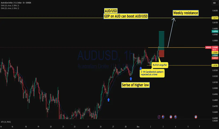 With upcoming GDP data on AUD price is showing multiple liquidity grab from 1h support level. There has been 3 1h rejection in a row at price level @0.65383 showing a higher probality move on this pair to the upside.