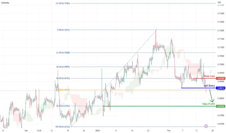 Looking at the H4 chart, my overall bias for AUDUSD is bearish due to the current price being below the Ichimoku cloud, and the ascending trend line has been broken, indicating a change in market structure. Looking for a pullback sell entry at 0.68535, stop loss at 0.69183 where the 50% Fibonacci line is, and take profit at 0.67541 where the 78.6% Fibonacci line is.