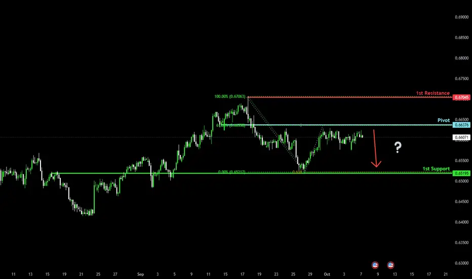 The Aussie (AUD/USD) is rising towards the pivot, which is a pullback resistance that aligns with the 61.8% Fibonacci retracement and could reverse to the 1st support, which has been identified as an overlap support.