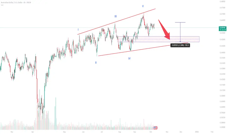 The AUD/USD pair has formed a clear ending diagonal pattern, signaling potential exhaustion of the current bullish trend. This structure, often seen at the final stage of an impulse wave, suggests that a corrective phase may soon follow. The diagonal appears complete with all five internal waves labeled (I-V), indicating that the market might be preparing for a deeper pullback.