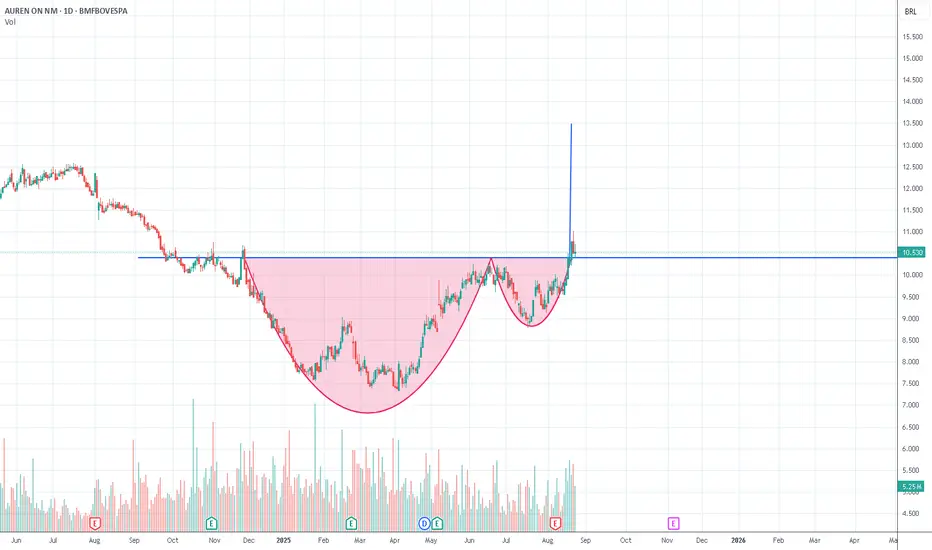 We can observe the formation of a cup and handle pattern in the AURE3 chart. If it manages to maintain the level of around R$10.41, it will be a bullish signal, with a target around R$13.50. Besides the chart pattern, it is important to note that the early redemption of debentures will reduce the average cost and extend the average term of its debt, in addition to optimizing the amortization schedule for the coming years. Therefore, AURE3 is showing a bullish bias, although it is still possible to see lower prices, as there is a downtrend in the monthly chart.