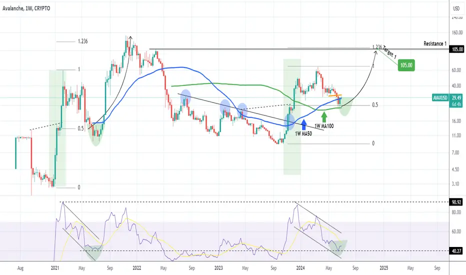 7 months ago we published the following analysis (December 14 2023, see chart below), expecting Avalanche (AVAXUSD), to correct back to the 1.0 Fibonacci level after a potential $55.00 hit: