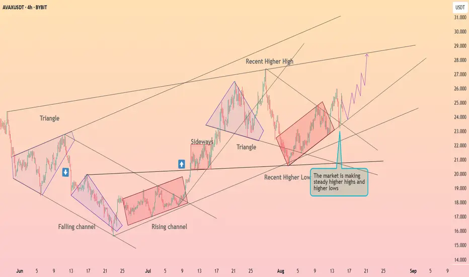 AVAXUSDT is maintaining a strong bullish structure, printing steady higher highs and higher lows. After breaking out of consolidation patterns, the market shows momentum for a run toward $27–$28. Support at $23 remains a critical level for bulls to defend in order to sustain the uptrend.