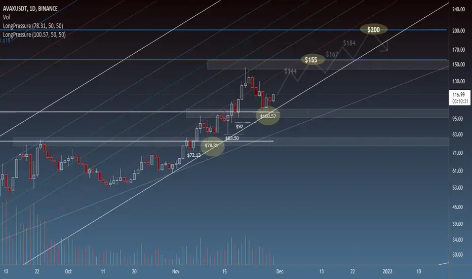 perfect bounce at the trendline around $100 and looking to shoot higher. targets based on expected resistance where 2x buying pressure subsides.