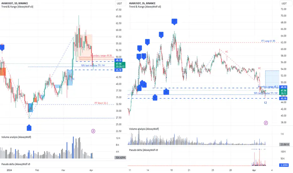 At the top, a seller's zone has formed with the upper boundary at 48.3 (red background), and at the bottom, a buyer's zone with the upper boundary at 45.18 (blue background). I anticipate price interaction with the seller's zone of interest. If the seller defends the range of 48-50, we can consider the possibility of sales, and the bearish vector 5-6 will become relevant with a target at 32.3. However, on the way to this target, sellers may be hindered by the buyer's zone, with which there was just interaction and a bullish reaction began, as clearly seen on the hourly timeframe.